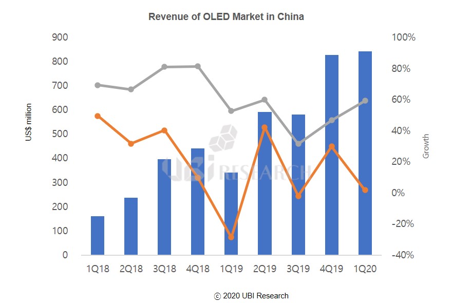 2020年1Q、中国のOLEDの売上高は8億4200万ドルで、コロナ19事態にもかかわらず前期に比べて(QoQ) 1.7%向上しており、前年同期比(YoY) 59.4%の高い上昇率を示した。中国の2020年OLED出荷量は全体の市場の23%水準であるが、2025年には45%まで拡大すると予想された。